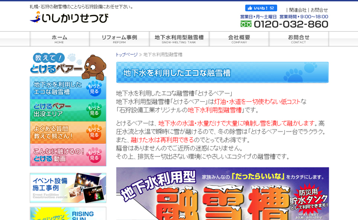 | サイト紹介 | 石狩で自社オリジナルの地下水利用型融雪槽「とけるベアー」の販売施工や住宅リフォームをおこなっている会社のホームページです。 「とけるベアー」は灯油・水道を一切使わない低コストな地下水利用型の融雪槽なので安心してご利用いただけます。 住宅リフォームに関するご相談等、お気軽にご相談下さい。 |