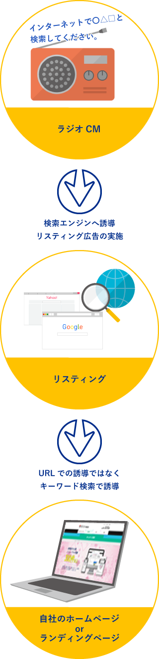 リスティング広告では、ラジオCMなどの複数の媒体を活用して、単独の広告ではなく、連動・誘導性を持たせます。